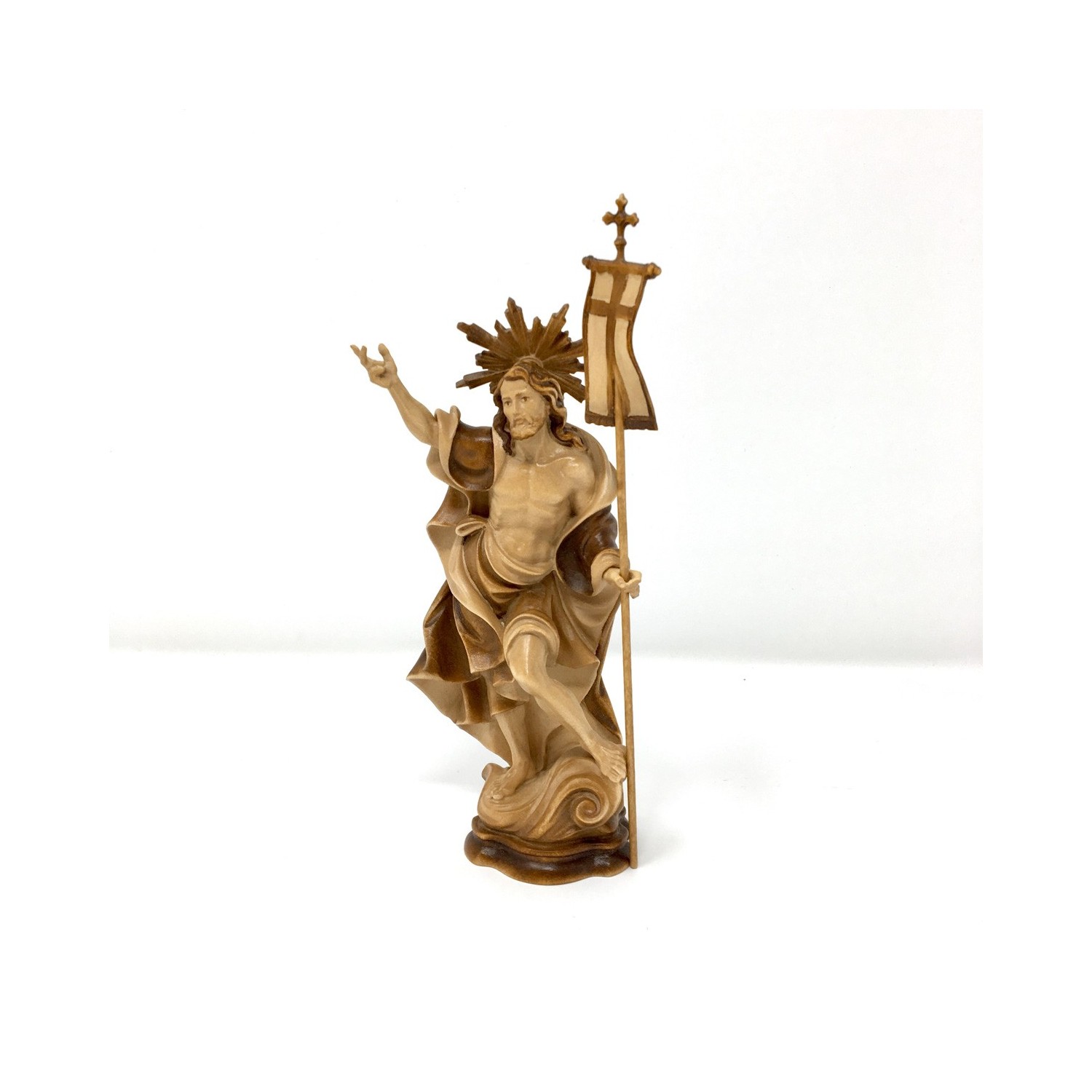 Statuina Cristo Risorto cm 17, in legno scolpito e dipinto tono su tono con colori ad olio dai maestri scultori della Val Gardena.