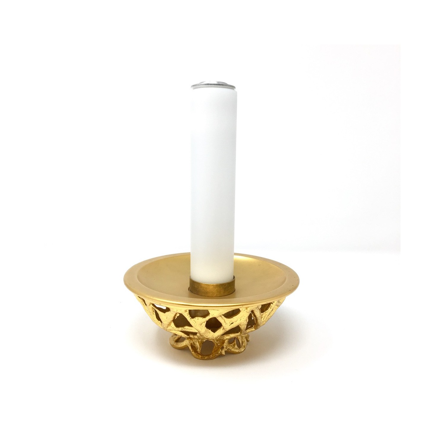 Candeliere in bronzo dorato. Realizzato in fusione. Le candele adatte a questo candeliere misurano 4 cm di diametro. il costo non comprende le candele.