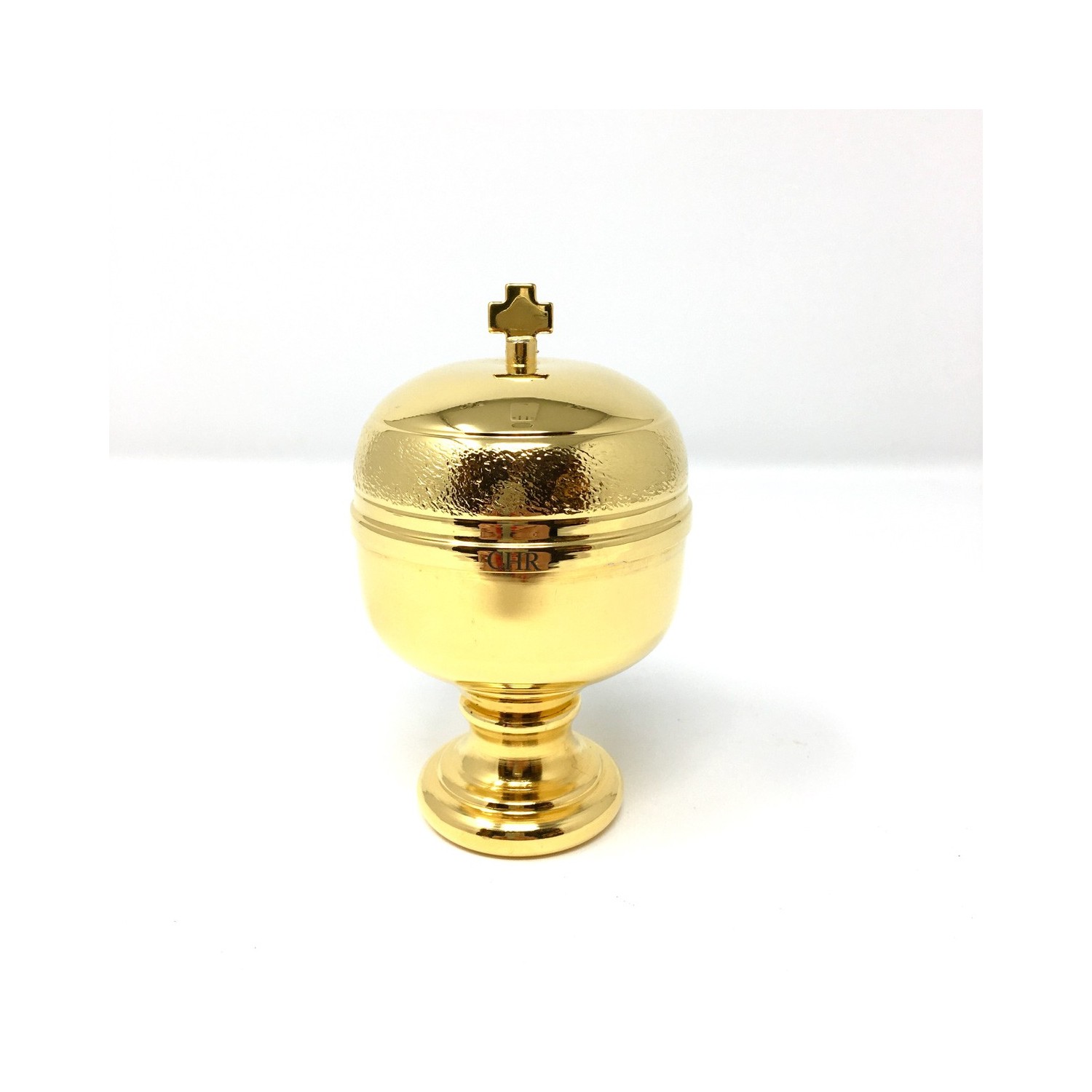 Contenitore per olio santo -crisma- in ottone dorato, per uso liturgico.