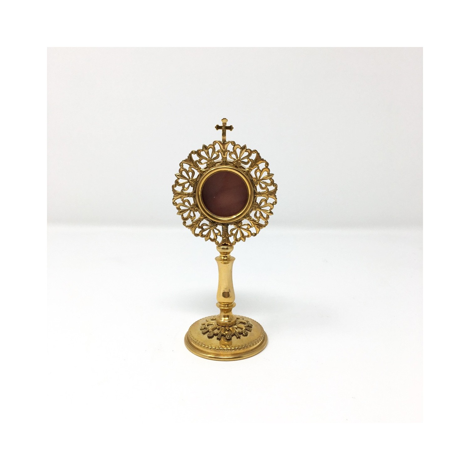 Reliquiario in ottone dorato con raggiera cesellata a mano.