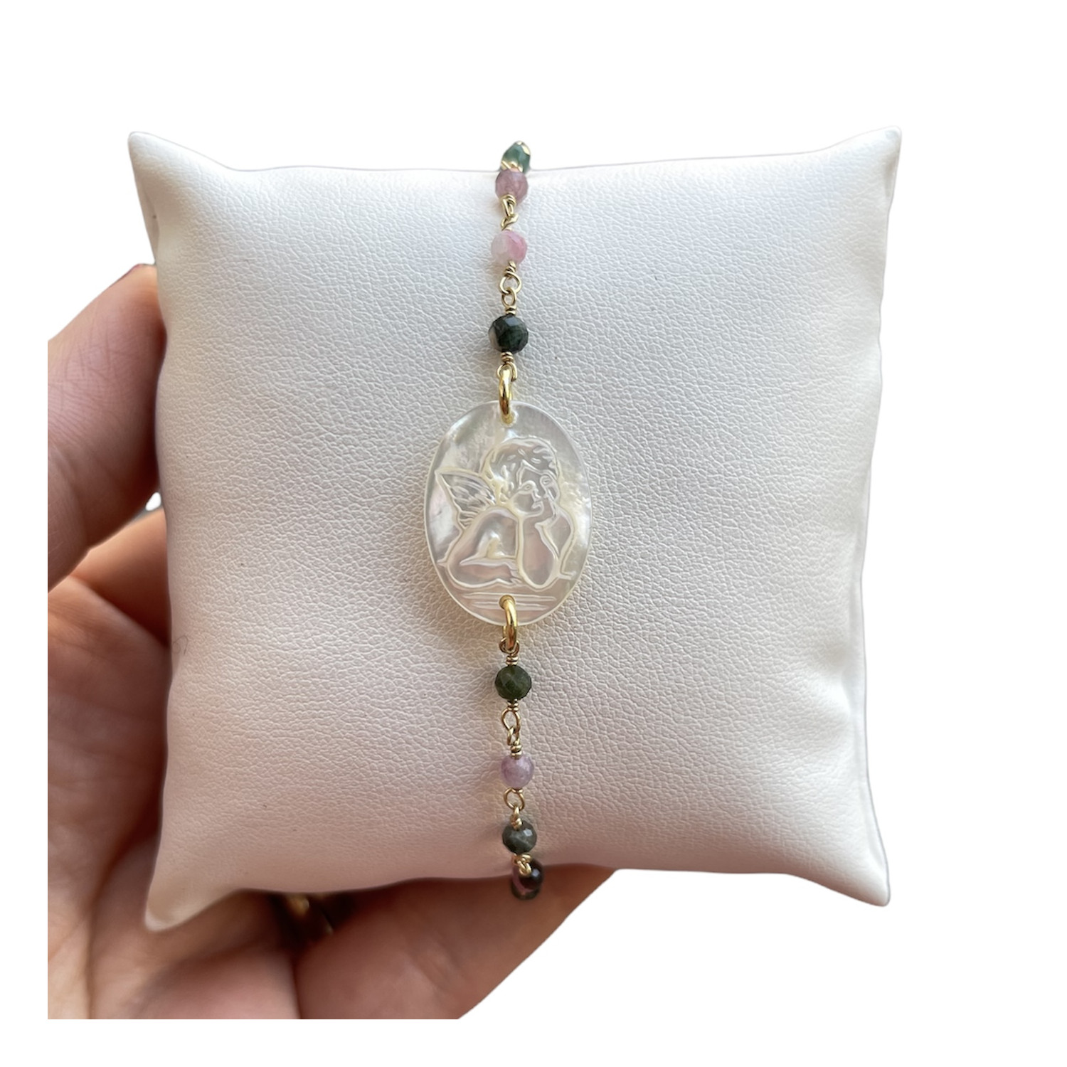 Bracciale in argento 925 dorato con tormaline e angelo in madreperla naturale.